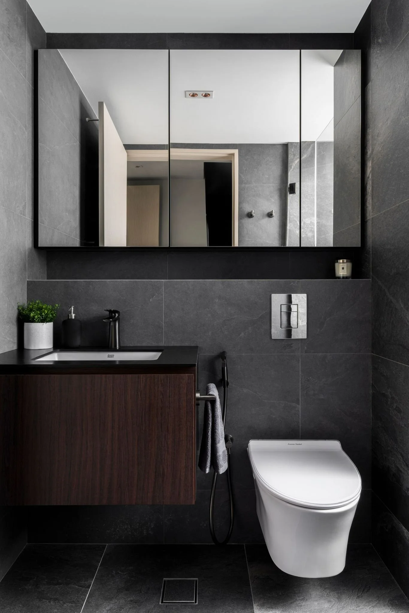 Step into serenity with a dark bathroom interior boasting dark grey matt surface tiles, complemented by dark walnut wood and gun metal bathroom accessories. Experience the tranquil ambiance of a monochromatic oasis, where textures and finishes take the spotlight, adding depth and intrigue to the space.